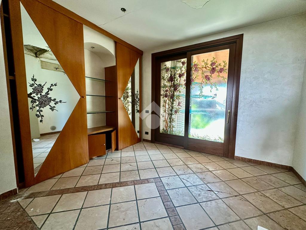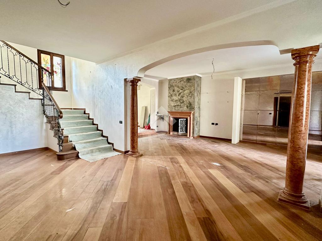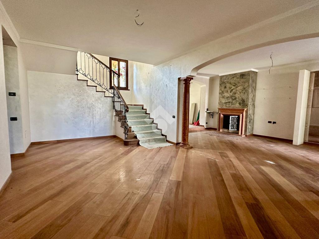 Entrando troviamo un grande e luminoso soggiorno con zona living con camino in marmo e zona pranzo con ampio serramento con vetro decorato che funge da collegamento, tramite un portico coperto, con l’area esterna retrostante. Rifiniture pavimento in parquet e serramenti in legno dotati di vetrocamera con persiane in legno. Sempre al piano terra troviamo una cucina abitabile di ampie metrature, un bagno di servizio, uno studio adibito a cameretta e un comodo ripostiglio.