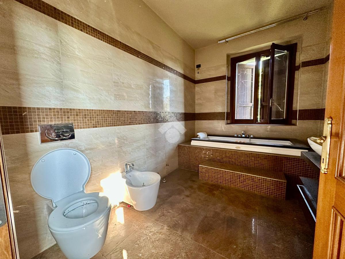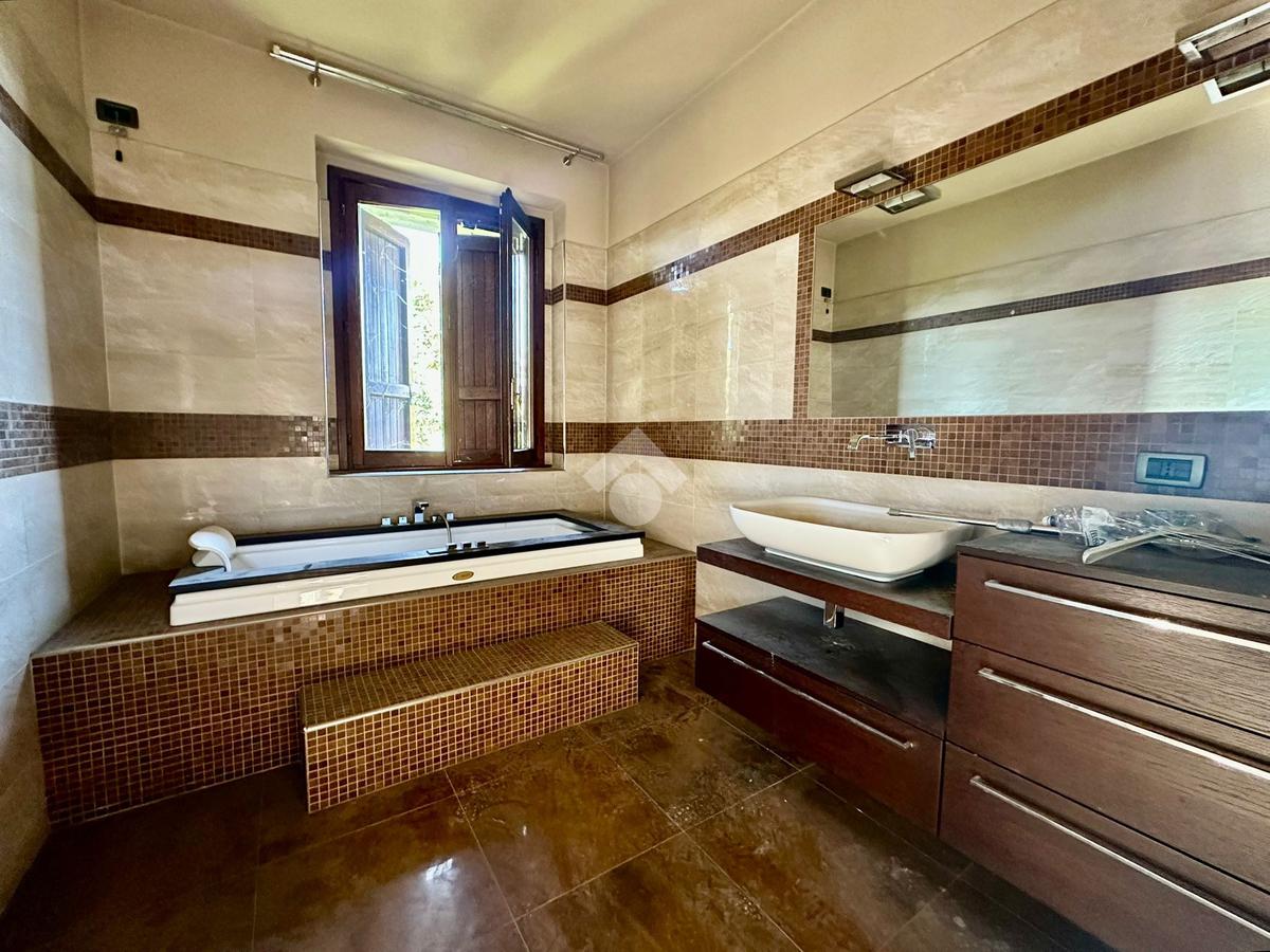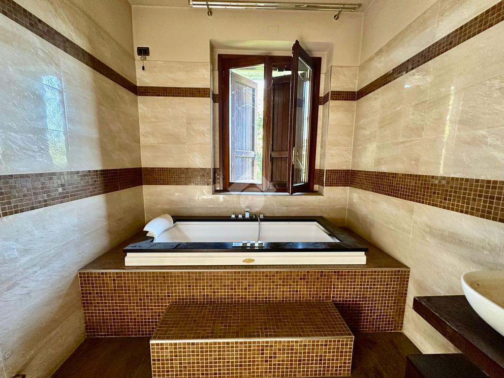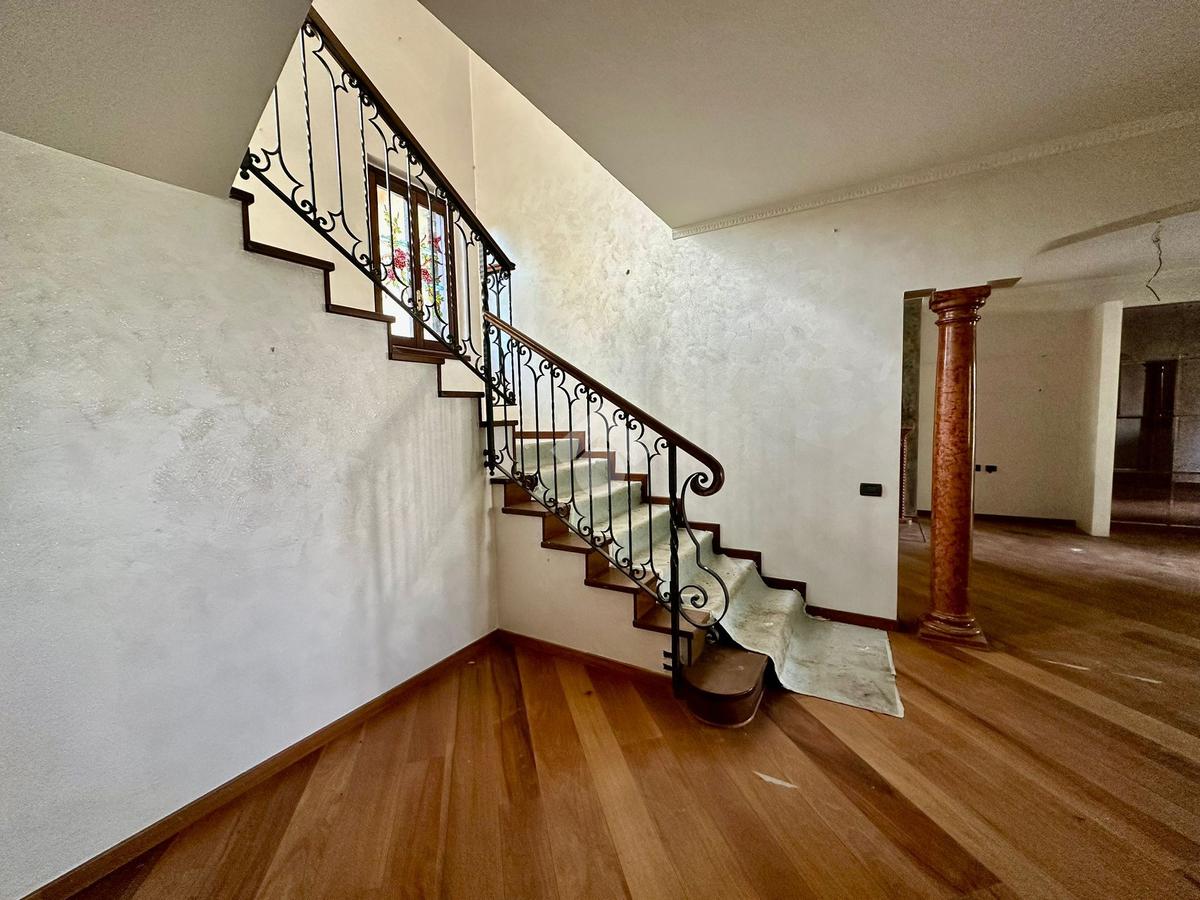 Le scale, di grande impatto visivo nell’ambiente, valorizzano gli spazi e ci accompagnano al piano primo dove si sviluppa il reparto notte. Sul piano troviamo una camera matrimoniale di generose metrature, una camera doppia con terrazzo, una stanza guardaroba adibita a cameretta e un bagno padronale sui toni del marrone con vasca idromassaggio. Un piccolo ripostiglio sul disimpegno delle scale completa il piano.